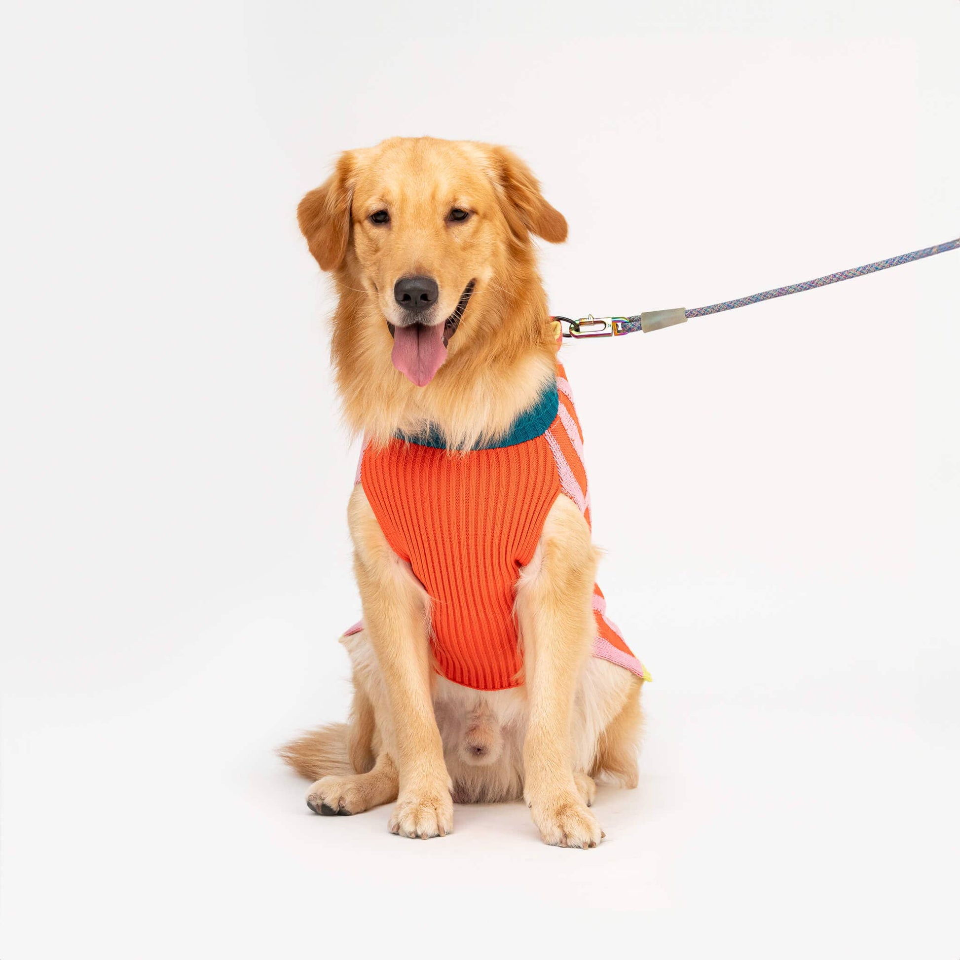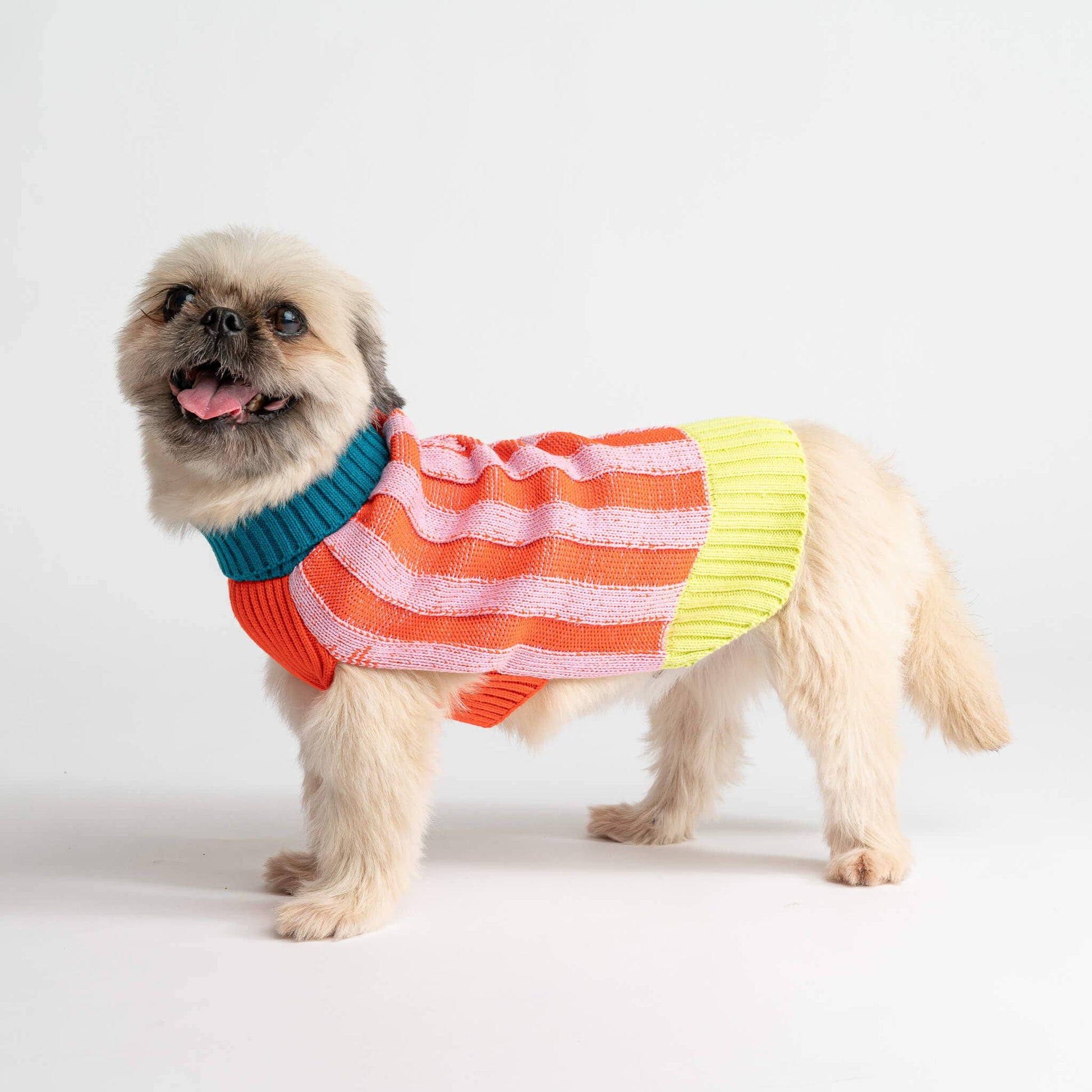 An outfit for your best friend! Soft plaited stripe dog sweater with stretchy ribbed underside and cuffed turtleneck collar. Has a harness keyhole for leash attachment on back. Made from hypoallergenic, washable jacquard knit.