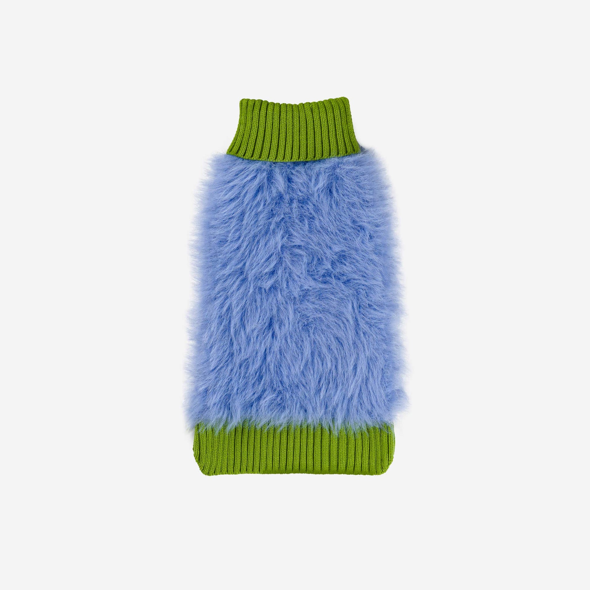 Soft faux fur knit dog sweater with contrast ribbed underside and turtleneck collar. Harness keyhole on back. Hypoallergenic, washable knit.