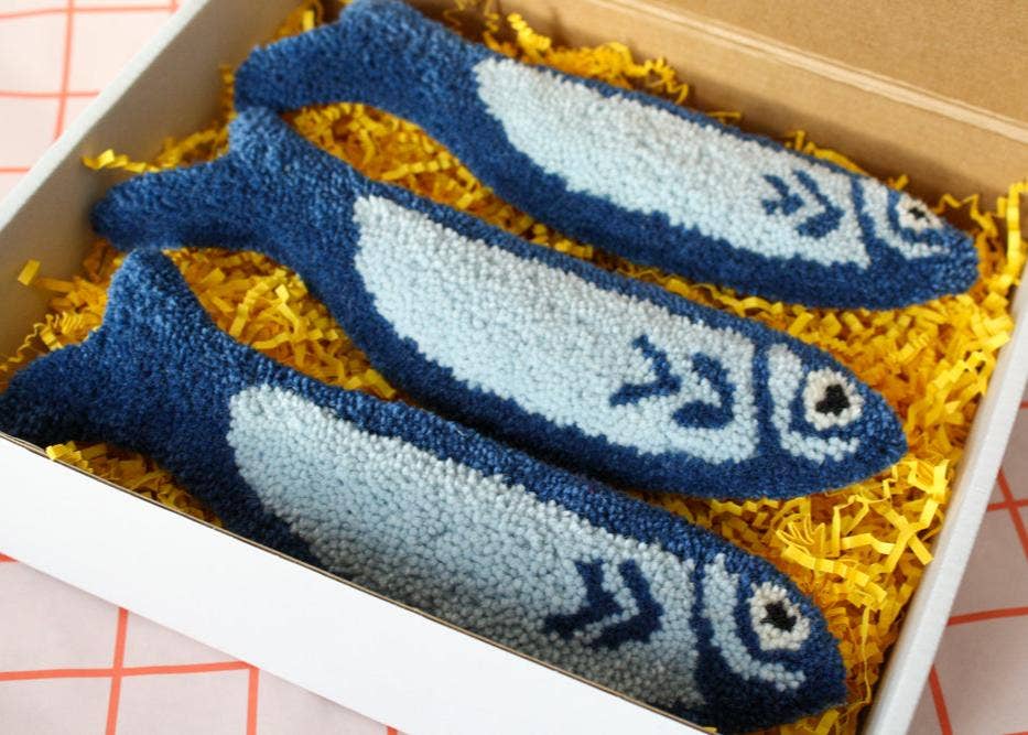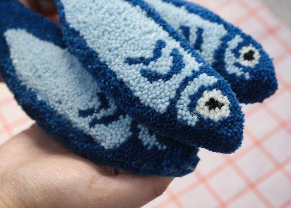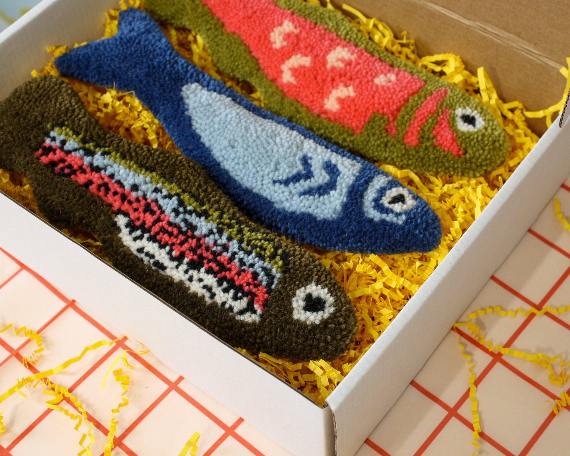 Each fish is hand tufted by Hannah with 100% wool yarn. In order to make it possible for me to offer these for wholesale, the margins are a little higher- thank you for understanding :)