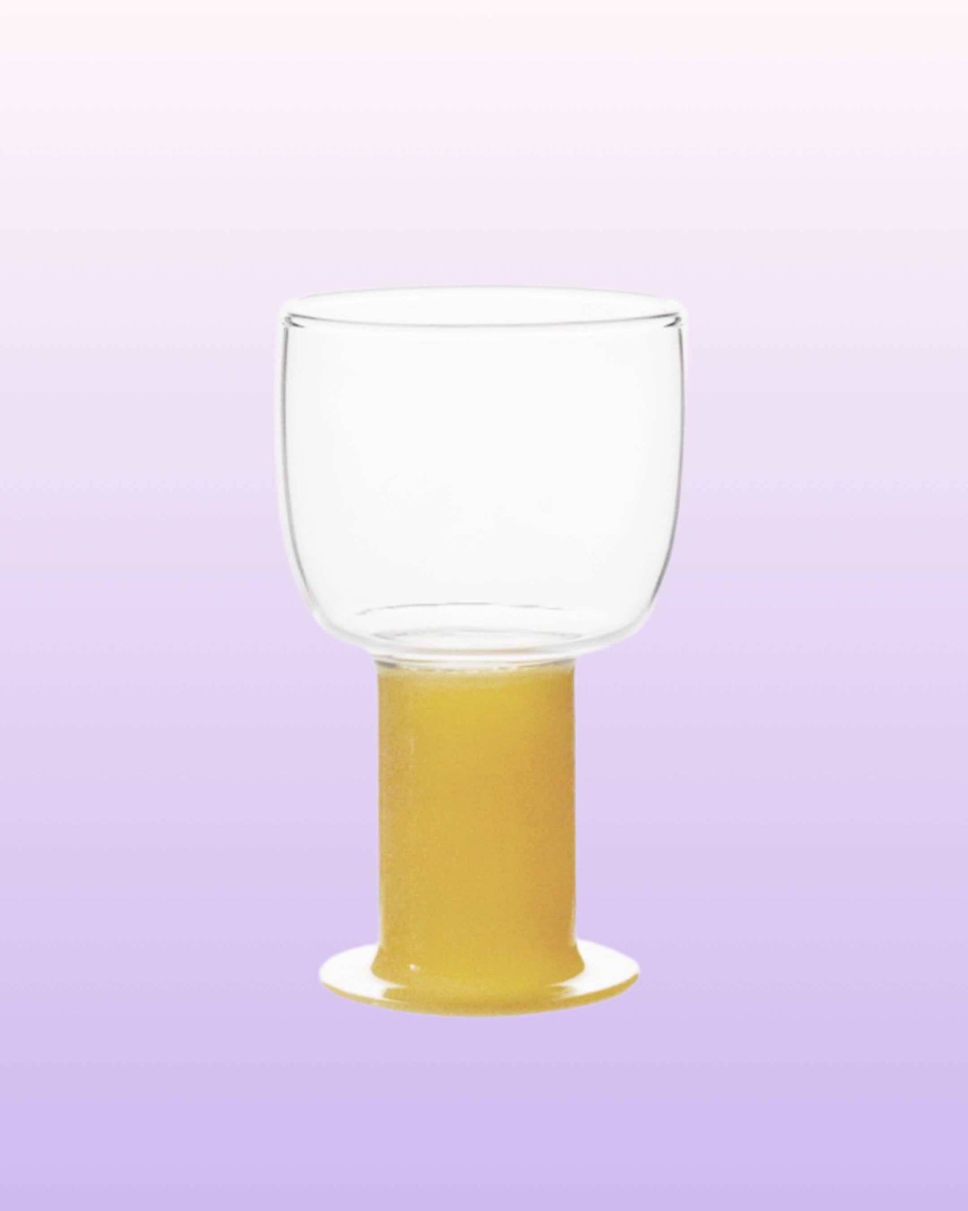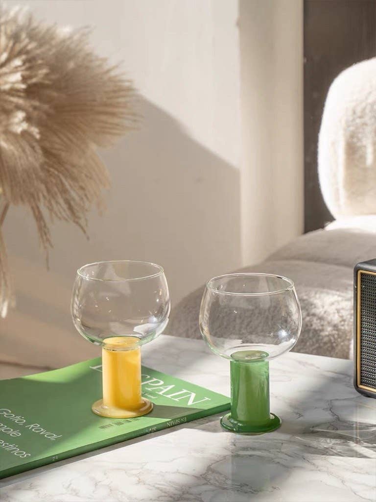 Featuring a chubby colored stem, these cute hand blown wine glasses are a stunning addition to any home bar or dinner party.