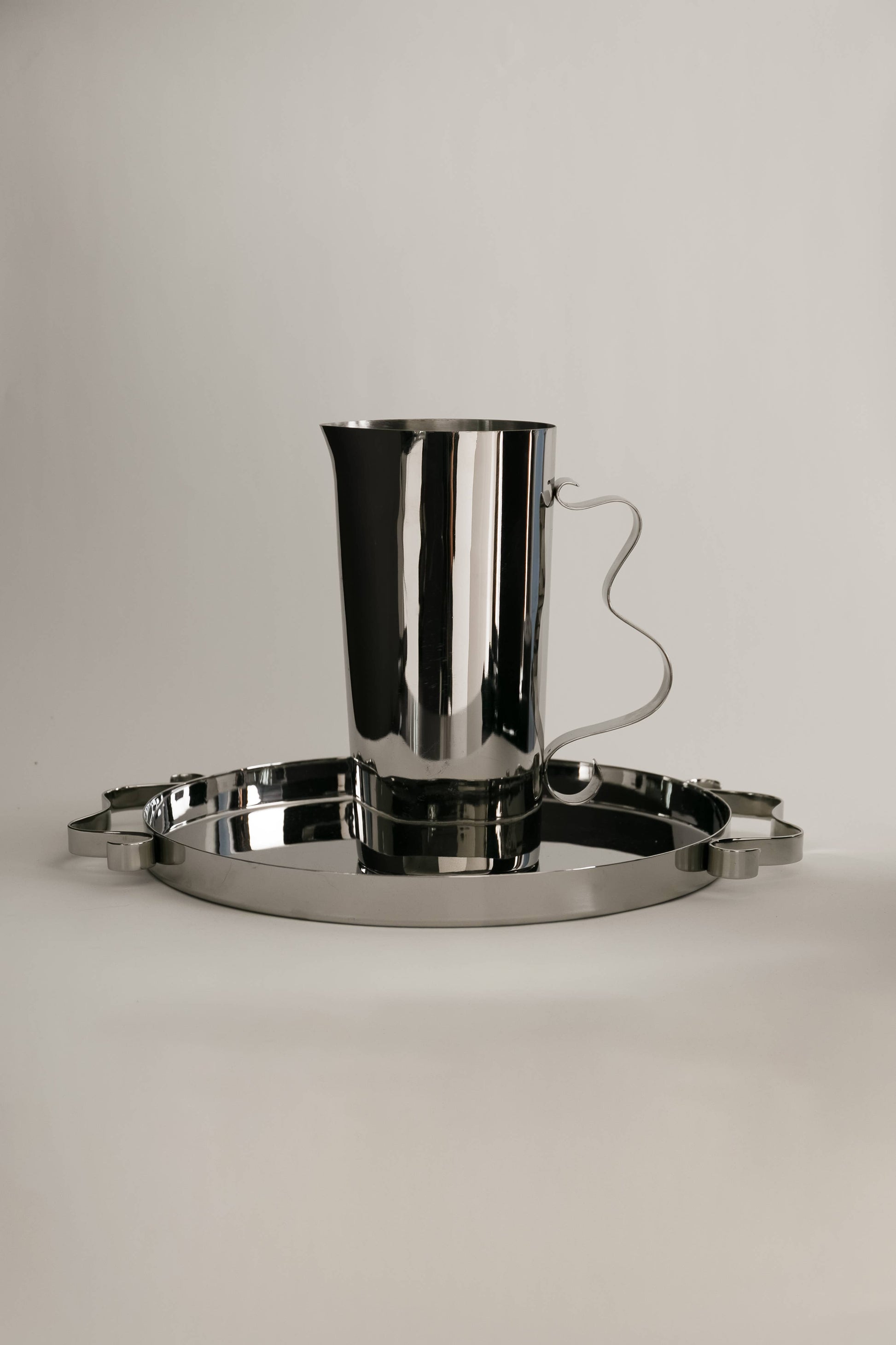 A mirror polished stainless steel pitcher with a soft, wavy, ribbon-like handle. This pitcher is ideal for serving drinks, coffee or tea, or simply as a decorative vase. Pairs beautifully with its sister Squiggle Tray.